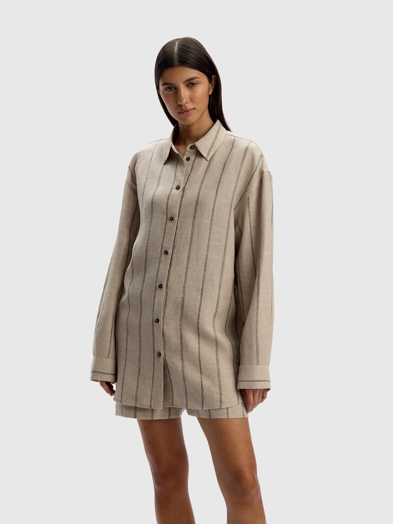 Свободная рубашка из тонкого льна в полоску — пластичный и легкий, он соткан из разных по цвету нитей, которые создают по-летнему уютный узор и мягко оттеняют загорелую кожу. Асимметричный нижний край и скругленные разрезы по бокам позволят носить рубашку навыпуск или заправить внутрь. European Flax — сертифицированный европейский лен высшего качества: помогает сократить глобальный углеродный след, безопасен для человека и становится лучше с каждой стиркой.