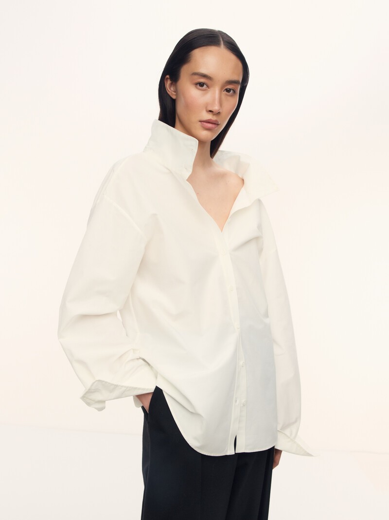 1. Создана из мягкой и легкой ткани, в которой сочетаются дышащий хлопок и гладкий шелк 2. Один силуэт — несколько образов: благодаря планкам и высокому воротнику рубашку легко стилизовать и для вечеринки, и для будней в офисе 3. Застежка на пуговицы из натурального перламутра