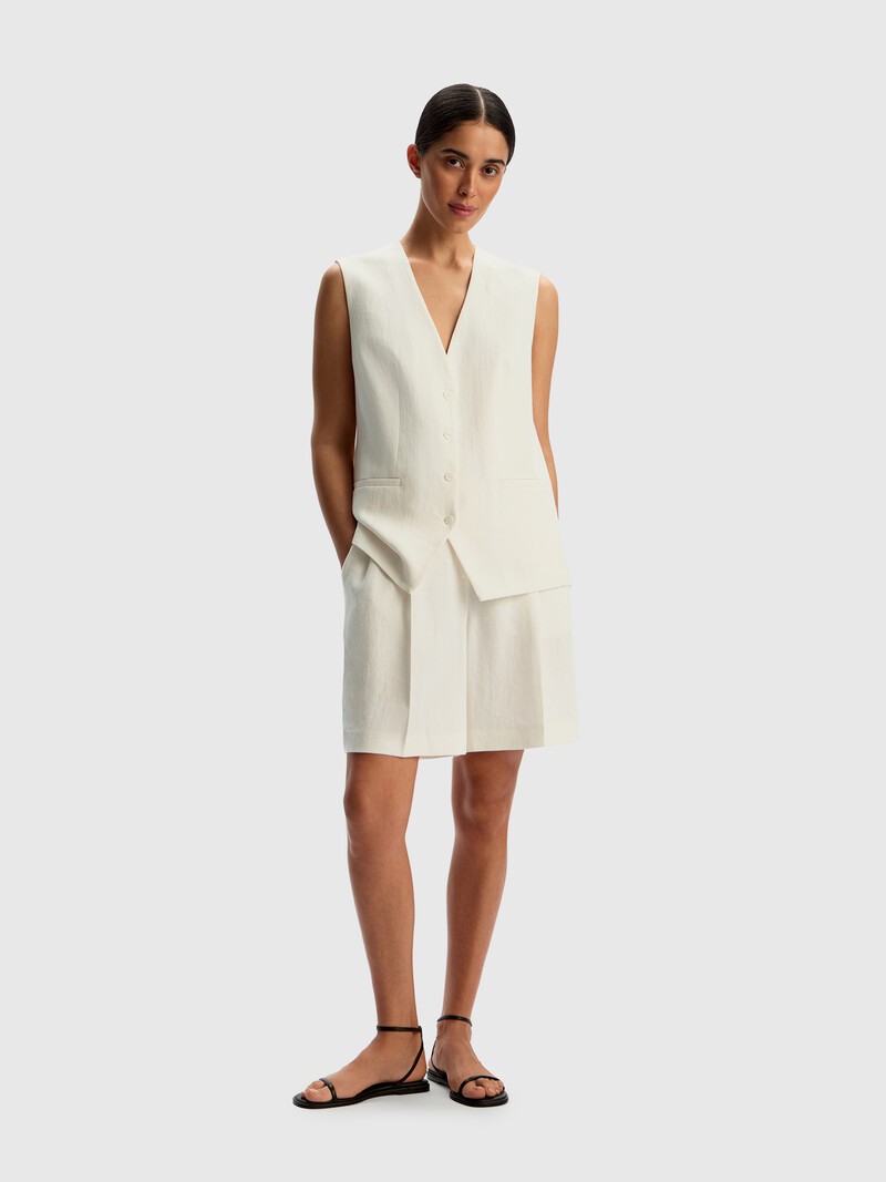 Классические бермуды из плотной ткани на основе льна. Мы сделали их очень лаконичными — с двумя защипами от талии, карманами только по бокам и незаметной фурнитурой. Материал от нашего португальского партнера сочетает в себе легкость льна с гладкостью искусственных волокон, лучше держит форму и меньше подвержен складкам.