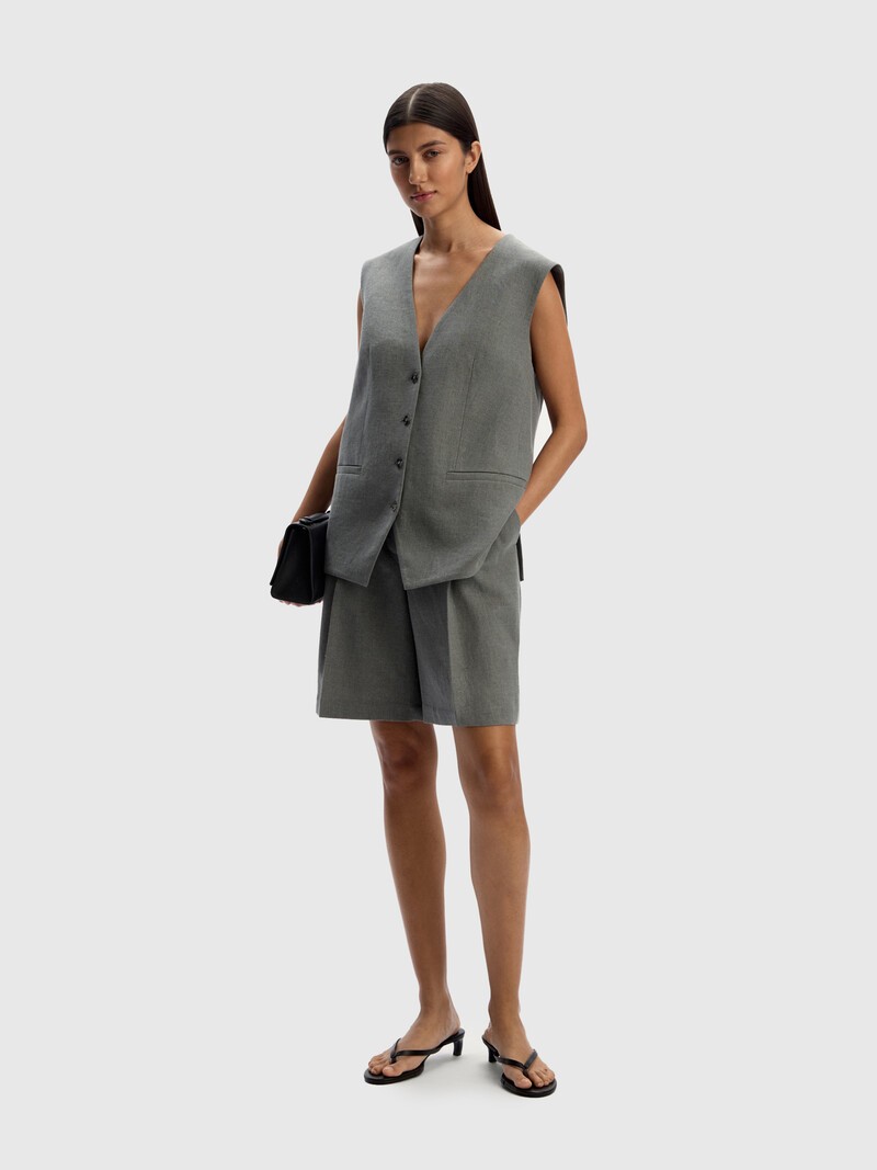 Классические бермуды из плотной ткани на основе льна. Мы сделали их очень лаконичными — с двумя защипами от талии, карманами только по бокам и незаметной фурнитурой. Материал от нашего португальского партнера сочетает в себе легкость льна с гладкостью искусственных волокон, лучше держит форму и меньше подвержен складкам.