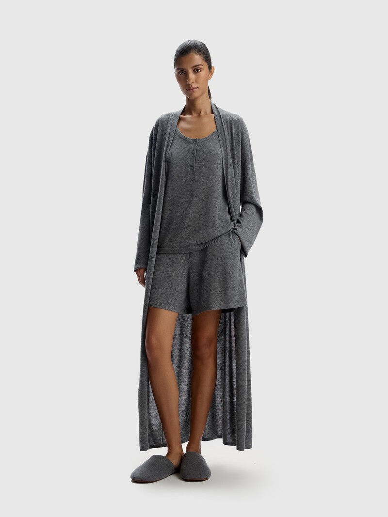 Короткие шорты с карманами по бокам и эластичным поясом — для отдыха дома или в путешествии. Связанный мелкими петлями в одну нить трикотаж получился гладким, пластичным и мягким. Сочетайте с топом и кардиганом из нашей коллекции.