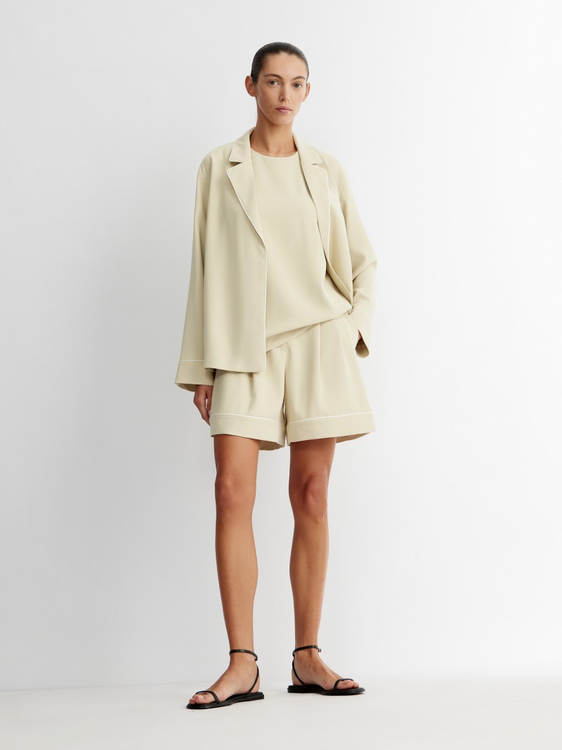 Бермуды со складками — прямые, с акцентными подворотами и длиной чуть выше колена, для отдыха в дневные часы или более строгих вечерних образов. Выполнены из гладкой матовой ткани, напоминающей плотный шелк, от португальского поставщика Riopele, и отделаны тонким кантом. Сочетайте с топом и жакетом из нашей коллекции. Застегиваются на молнию и крючок. Сделано в России.