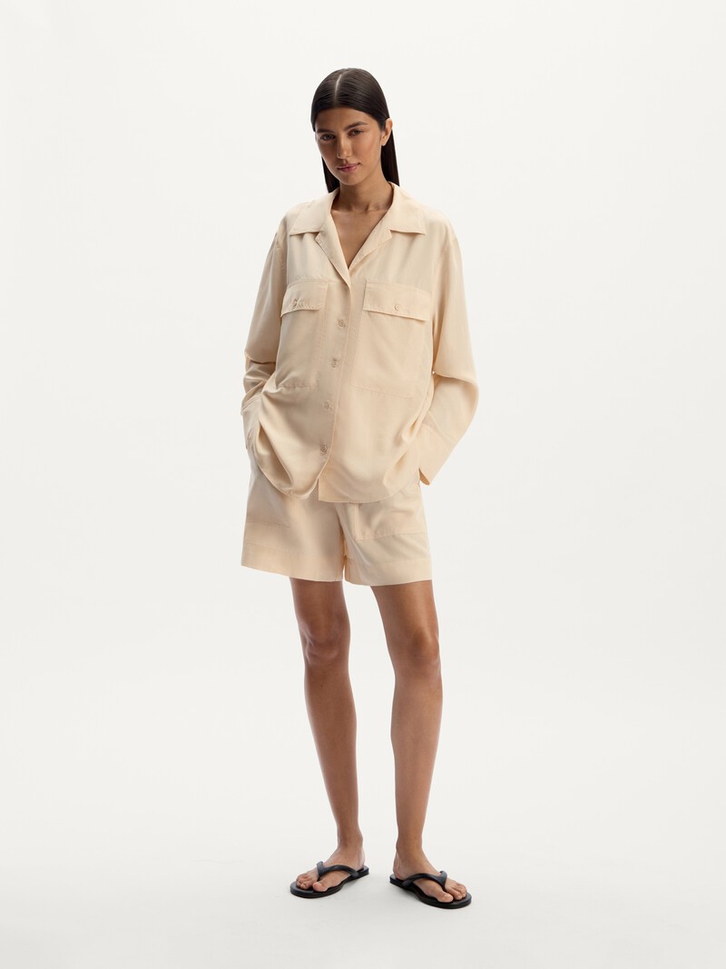 Аккуратные шорты с элементами стиля сафари — акцентами швами и крупными карманами. Широкий эластичный пояс с кулиской позволяет отрегулировать посадку по талии. Выполнены из мягкой шелковистой ткани на основе модала с добавлением искусственных волокон, благодаря чему изделие меньше мнется и хорошо держит форму. Сочетайте с блузкой из нашей коллекции. Без застежки. Сделано в России.