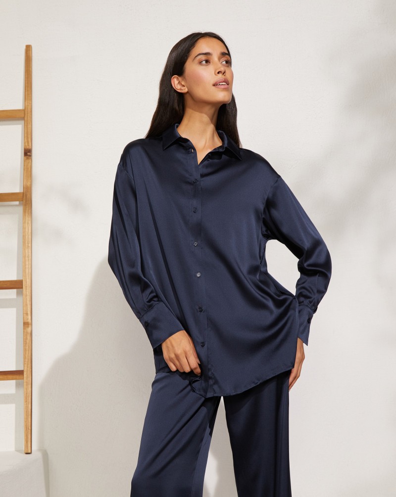 Рубашка из Mulberry шелка. Наш бестселлер, лаконичная рубашка из струящегося шелка, которая дополнит вечерние образы с брюками из кожи и летящих тканей, кроп-топами и сарафанами из тонкого хлопка. - Застежка на пуговицы - 100% Mulberry шелк — самый ценный вид шелковых волокон. Такой шелк сияет и переливается при любом освещении, а его нити тоньше, легче и прочнее аналогов Сделано в Беларуси.