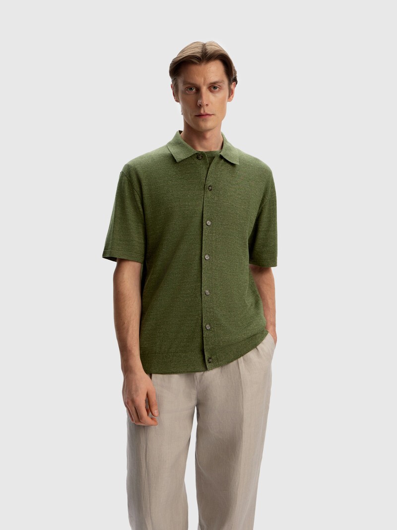 Свободная рубашка из легкой пряжи — тончайшего и прочного трикотажа, в котором сочетаются нити разных цветов. Естественные для льна утолщения и узелки придают пряже по-летнему уютную фактуру. Комбинируйте с льняными брюками из нашей коллекции — образ получится расслабленным и комфортным.