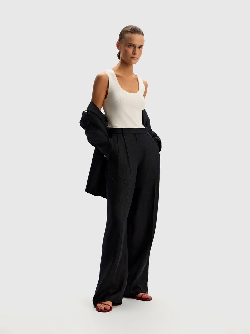 Летняя классика — черные брюки полной длины, с посадкой чуть ниже талии. Складки и стрелки вытягивают силуэт, делая беззаботный образ более собранным. И даже в теплые дни в брюках не будет жарко благодаря свободному крою и натуральному льну — дышащему и приятному. European Flax — сертифицированный европейский лен высшего качества: помогает сократить глобальный углеродный след, безопасен для человека и становится лучше с каждой стиркой.
