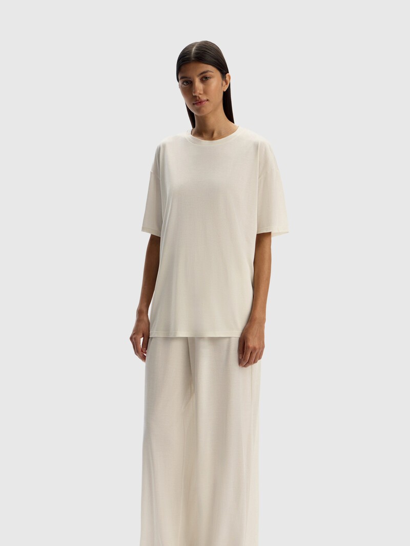 Базовая футболка из тонкого струящегося трикотажа приятно охлаждает кожу и создает ощущение легкости благодаря свободному силуэту. Шелк придает материалу деликатный блеск, поэтому футболка будет уместна как в пляжных образах, так и за ужином. Можно составить комплект с брюками из нашей коллекции. Чтобы трикотаж из натурального шелка служил вам долгие годы, храните его на полке и не гладьте утюгом.