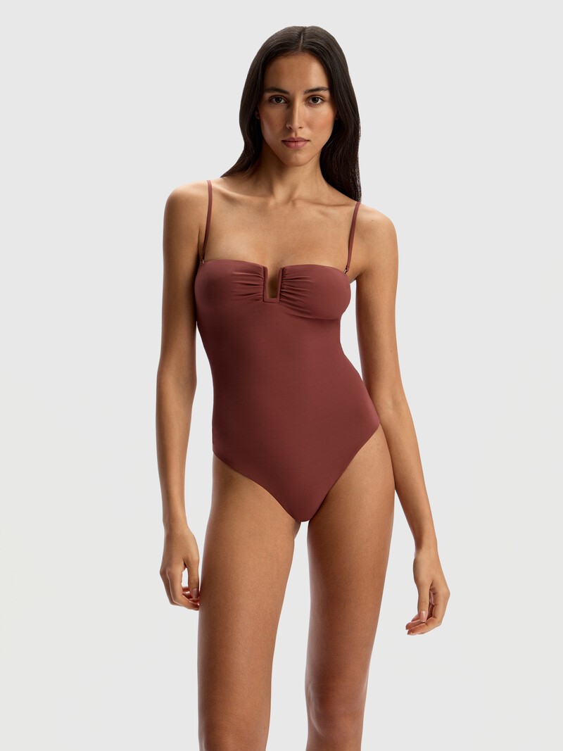 Лаконичный слитный купальник с полуоткрытой спинкой и косточками в боковых швах на уровне груди. При необходимости прочные и плоские бретели с регуляторами можно отстегнуть, а тонкие чашки убрать — силиконовая лента по верхнему краю обеспечит комфортное прилегание. Выполнен из гладкого плотного материала, который хорошо держит форму и не теряет со временем яркости и эластичности, и дополнен подкладкой из более легкой и тонкой ткани. Продается в водонепроницаемой косметичке из рогожки с застежкой на кнопки.