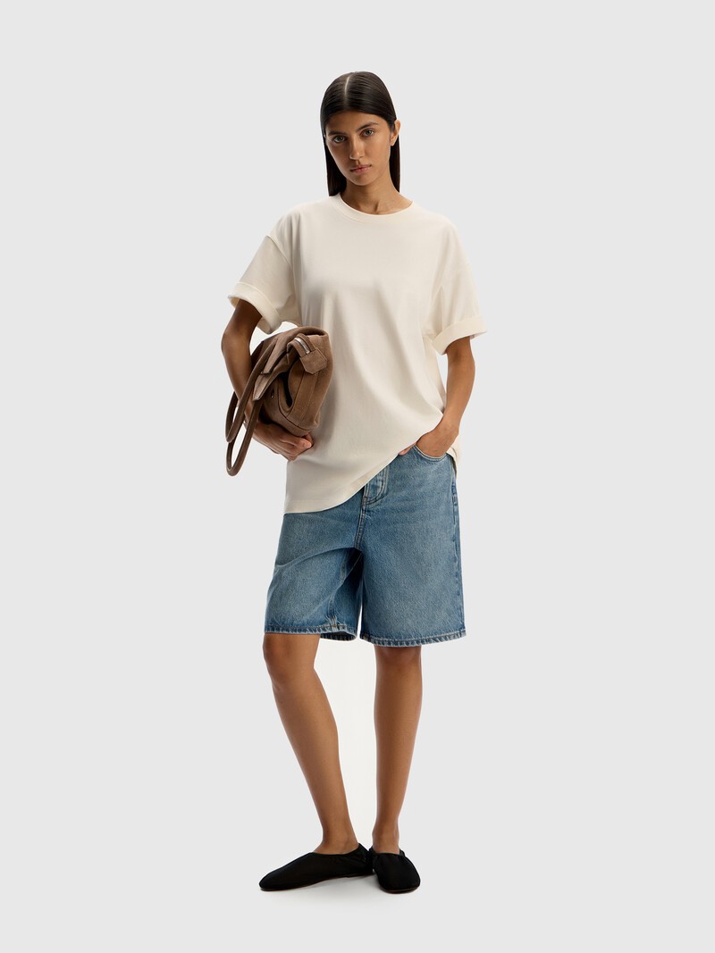 Прямые шорты на базе джинсов-бойфрендов — для расслабленных образов с футболкой или лонгсливом в летние дни. Универсальная длина до середины колена, низкая посадка и патч из натуральной кожи. Мы сшили их из денима плотностью 14,5 Oz, который красиво раскрывается в варке. Застегиваются на болты. Материал окрашен по инновационной технологии Indigo Flow, благодаря которой выбрасывается на 53% меньше углеводородов и расходуется на 17% меньше воды. Международный сертификат GOTS (Global Organic Textile Standard) — самый строгий стандарт для органических тканей, подтверждает не только экологичность выращивания, но и социальную ответственность производителя, то есть хорошие условия и достойную оплату труда фермеров.