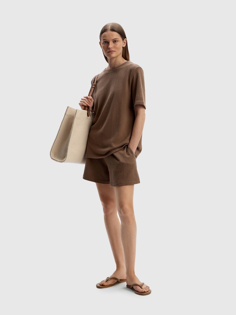 Аккуратные шорты мини — для самых уютных образов дома или на отдыхе. Воздушный и фактурный трикотаж напоминает вязаные вещи, отлично дышит и не создает лишний объем.