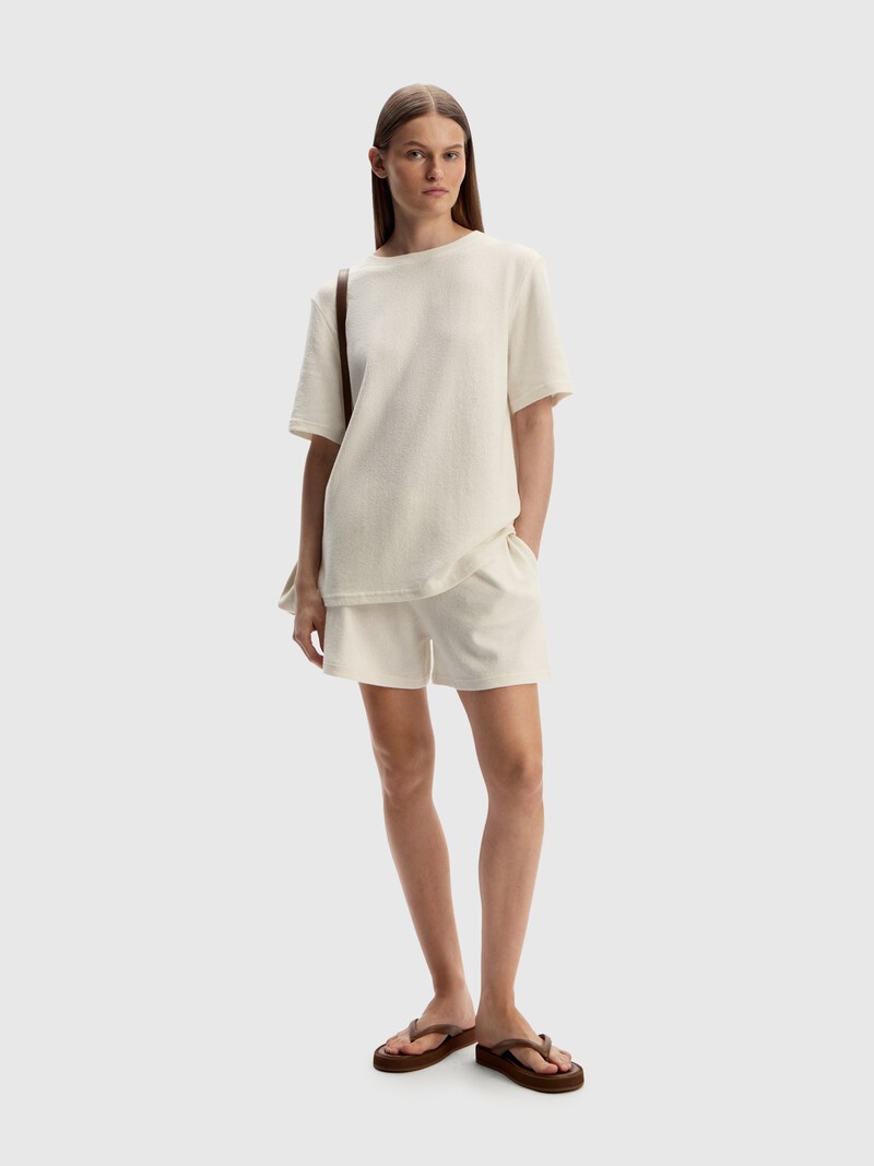 Аккуратные шорты мини — для самых уютных образов дома или на отдыхе. Воздушный и фактурный трикотаж напоминает вязаные вещи, отлично дышит и не создает лишний объем. Могут немного просвечивать — рекомендуем подбирать белье в тон.