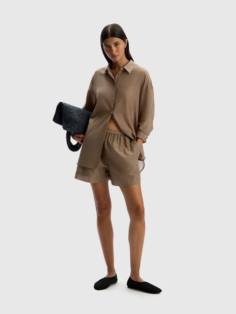 Свободные шорты из невесомой смеси хлопка и шелка с еле заметным глянцем — для многослойных образов в городе и на курорте. Нижний слой выполнен из батиста, а тонкий эластичный пояс позволяет отрегулировать посадку. При выборе размера убедитесь, что шорты сидят свободно — так они прослужат вам дольше.