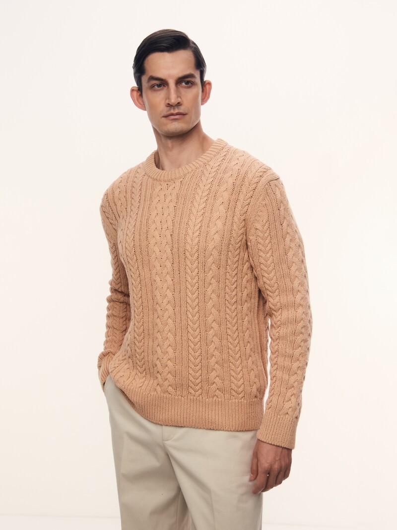 1. Легкий и дышащий: джемпер связан из воздушной хлопковой нити объемным переплетением, которое напоминает ручную работу 2. Сочетание кос и жгутов делает образ более выразительным 3. Базовый силуэт без лишнего объема — легко интегрировать в гардероб