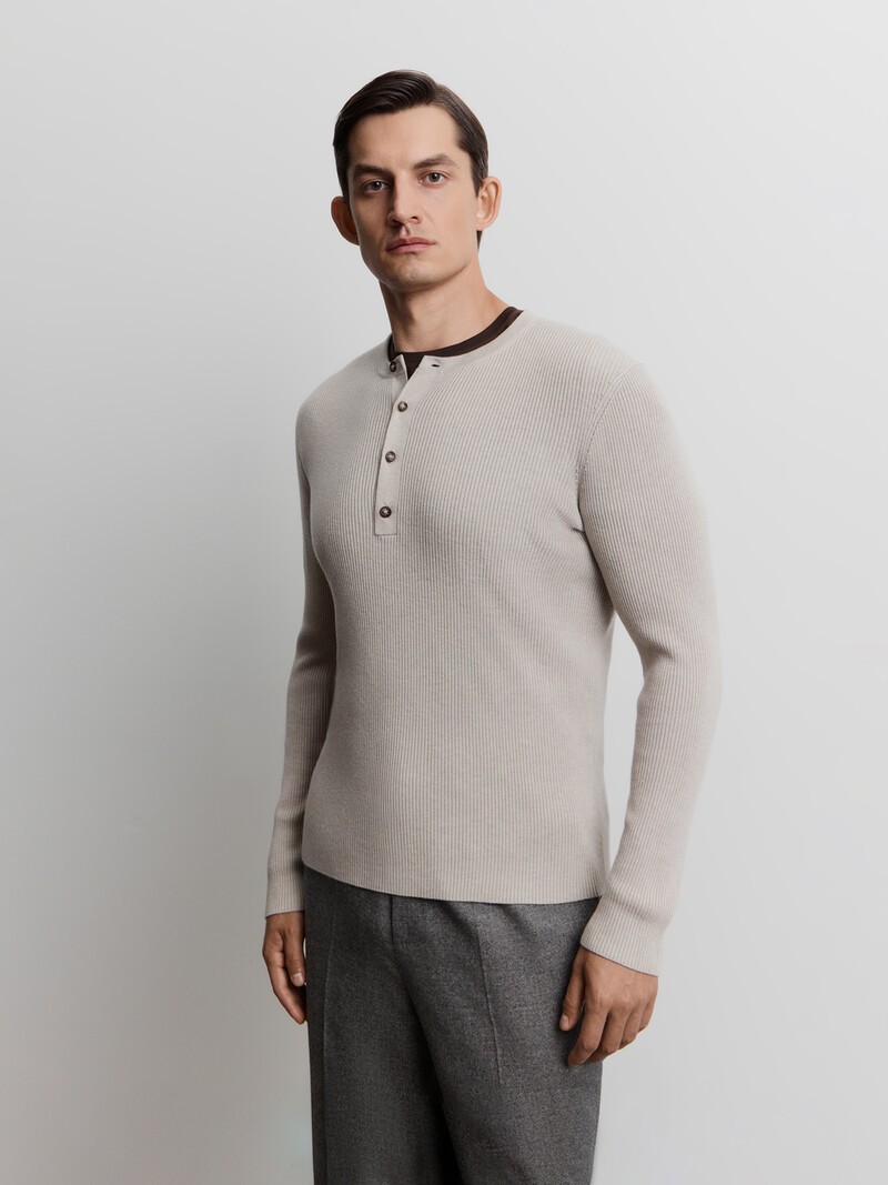 Универсальный джемпер с воротником хенли с легкостью впишется в многослойные образы в прохладные дни. Мягкий и легкий трикотаж из шерсти австралийского мериноса связан эластичным переплетением в рубчик, комфортно облегает силуэт и хорошо держит форму. Сделано в Китае.