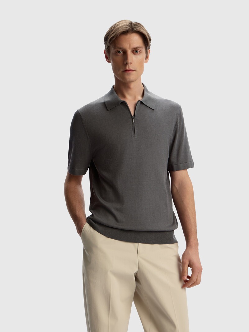 Джемпер-поло с мягким воротником легко впишется в базовый летний гардероб. Легкий, нежный и полностью натуральный трикотаж с деликатным лоском хорошо дышит и комфортно прилегает к телу. Нижний край связан резинкой, чтобы джемпер можно было присборить на бедрах. Застегивается на тонкую молнию с металлическим пуллером. Сделано в Китае.