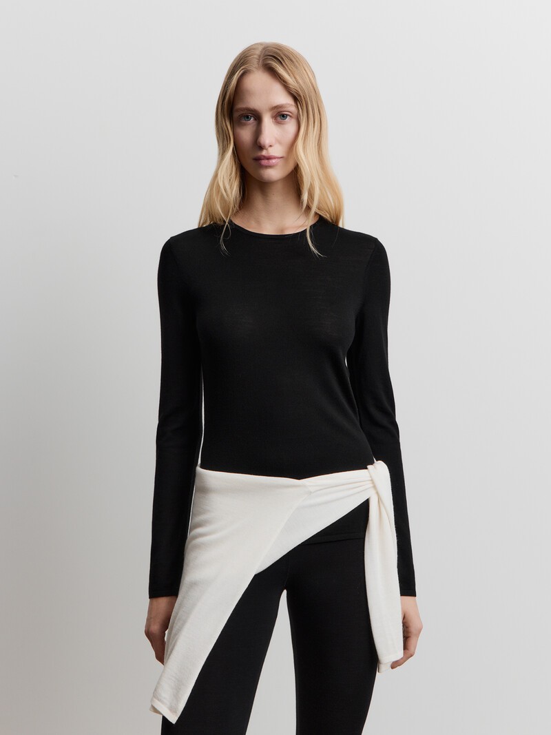 Для этого лонгслива мы выбрали нежную тонкую пряжу, в которой сочетаются шерсть мериноса, шелк и кашемир. Такая пряжа не часто встречается в коллекциях брендов из-за высокой стоимости — одежда из нее окутывает тело невесомым теплом в период остывающего лета и легко сочетается с другими вещами зимой. Полупрозрачный трикотаж с деликатным блеском связан крошечными петлями и может слегка просвечивать. Пожалуйста, обращайтесь с изделием аккуратно — аксессуары и грубые предметы могут оставить зацепки или повредить нить. У этого изделия низкая пиллингуемость. При правильном уходе первые пилли могут появиться на нем в среднем через 10 носок. Сделано в Китае.