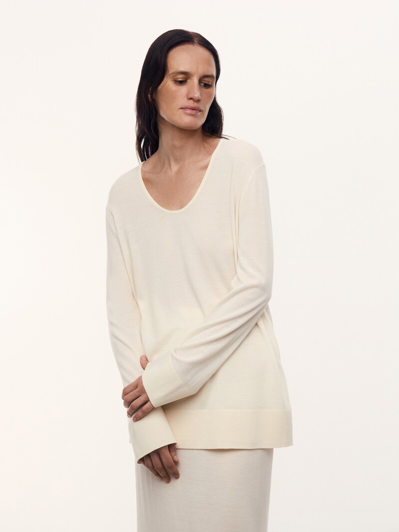 1. Связан в одну нить из тонкой мериносовой шерсти и натурального шелка — мягко драпируется и деликатно поблескивает 2. Удобный для многослойных образов благодаря просторному удлиненному силуэту и глубокому вырезу 3. Можно носить весь теплый сезон: весной — с вязаной юбкой, летом — с шортами.