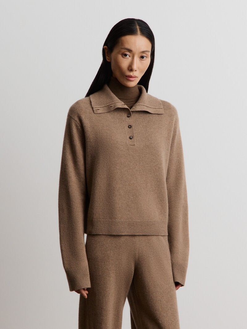 Новинка в нашей коллекции — кашемировый джемпер с высоким воротником, который с помощью пуговиц можно сделать отложным. Теплый и легкий, он связан в две нити из нежной, пушистой пряжи — пуха кашмирских коз, обитающих на высокогорных плато Внутренней Монголии. При трении о шероховатые поверхности пушинки кашемира могут скатываться. Чтобы удалить пилли, пользуйтесь специальной машинкой.