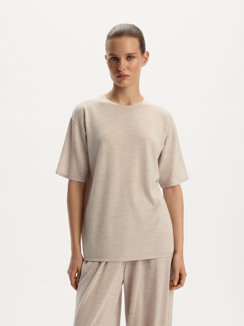 Свободный базовый джемпер — аккуратный круглый вырез, короткий рукав, деликатная обработка. Связан в одну нить мелкими петлями из мягкой шерсти мериноса, которая хорошо отводит влагу и совсем не колется. Трикотаж получился пластичным, легким и приятным на ощупь. Пожалуйста, обращайтесь с джемпером бережно: острые предметы и аксессуары могут оставить на тонком трикотаже зацепки или повредить нить. У этого изделия низкая пиллингуемость. При правильном уходе первые пилли могут появиться на нем в среднем через 10 носок. Сделано в Китае.