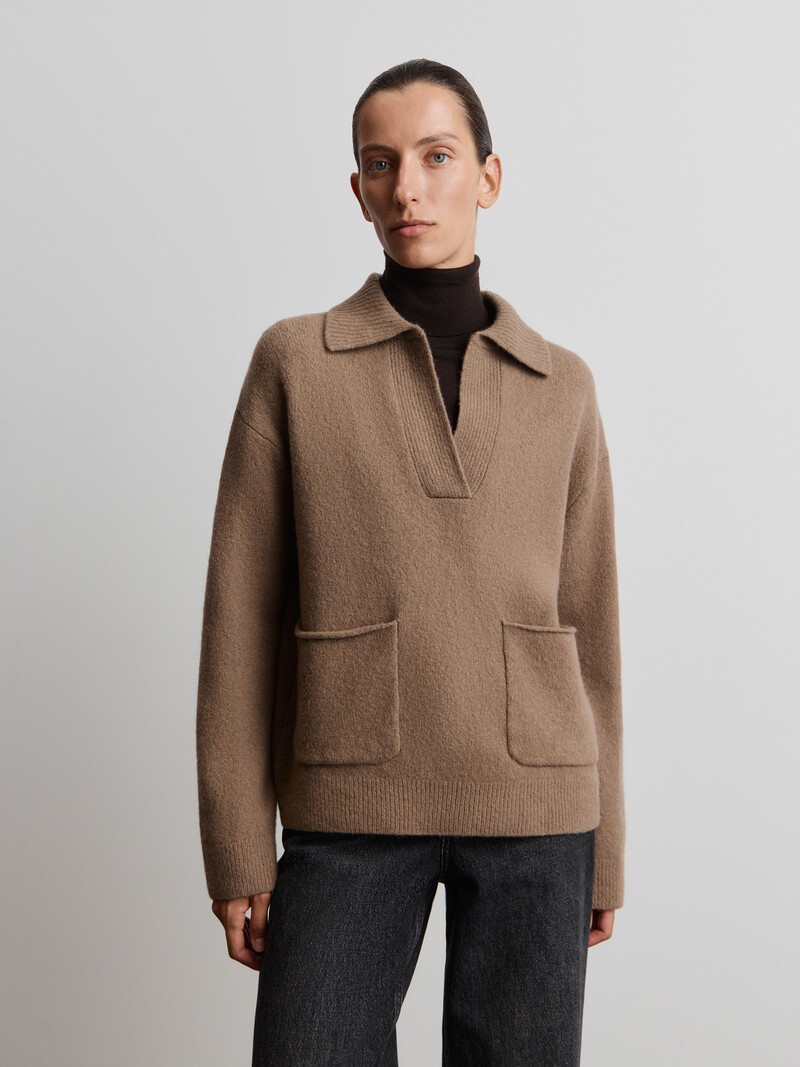 Уютный джемпер с широким отложным воротником. Не слишком глубокий V-вырез, комфортный свободный силуэт. Джемпер связан в одну нить из легкой и нежной пряжи с добавлением шерсти тибетского яка, поэтому согреет вас даже в морозы. Объемная нить придает трикотажу пластичность, а рибана по краям не позволит изделию растягиваться. У этого изделия низкая пиллингуемость. При правильном уходе первые пилли могут появиться на нем в среднем через 10 носок. Сделано в Китае.