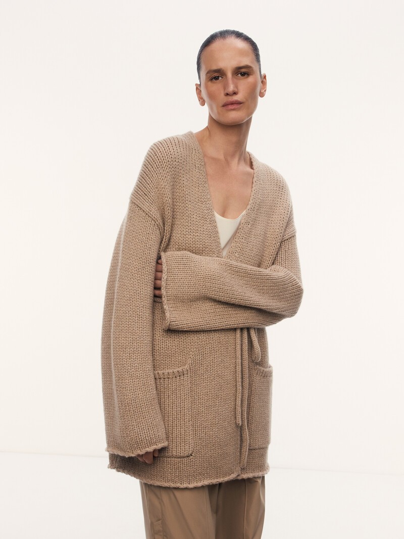 1. Связан из 100% кашемира от фабрики MORO, которая создает пряжу для Hugo Boss, Bogner, Armani и Givenchy 2. Пряжа — как шнурок, сплетнный из нескольких тонких нитей. Такая технология делает нить гладкой, прочной и устойчивой к пиллингу 3. На одно изделие уходит пух 8 коз, поэтому кардиган получается весомым 4. Чтобы края карманов не оттопыривались, мы связали их резинкой 5. В кардигане нет застежки, поэтому мы добавили длинный вязаный пояс