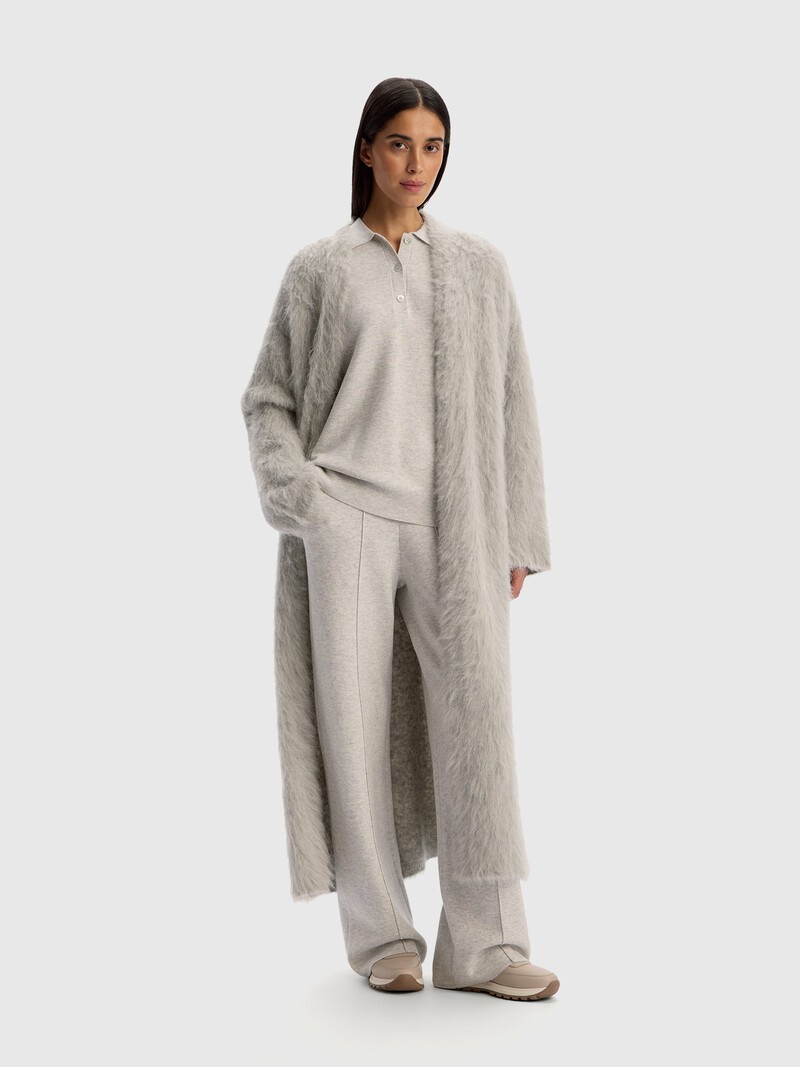 Длинный и теплый кардиган, силуэт которого повторяет наши расслабленные пальто-халаты — в такой так и хочется укутаться в прохладные дни. Связан из греющей, чуть покалывающей шерсти альпаки с добавлением волокон нейлона для долговечности. Чтобы природный ворс стал еще пушистей и гуще, трикотаж пропустили через специальные валики.