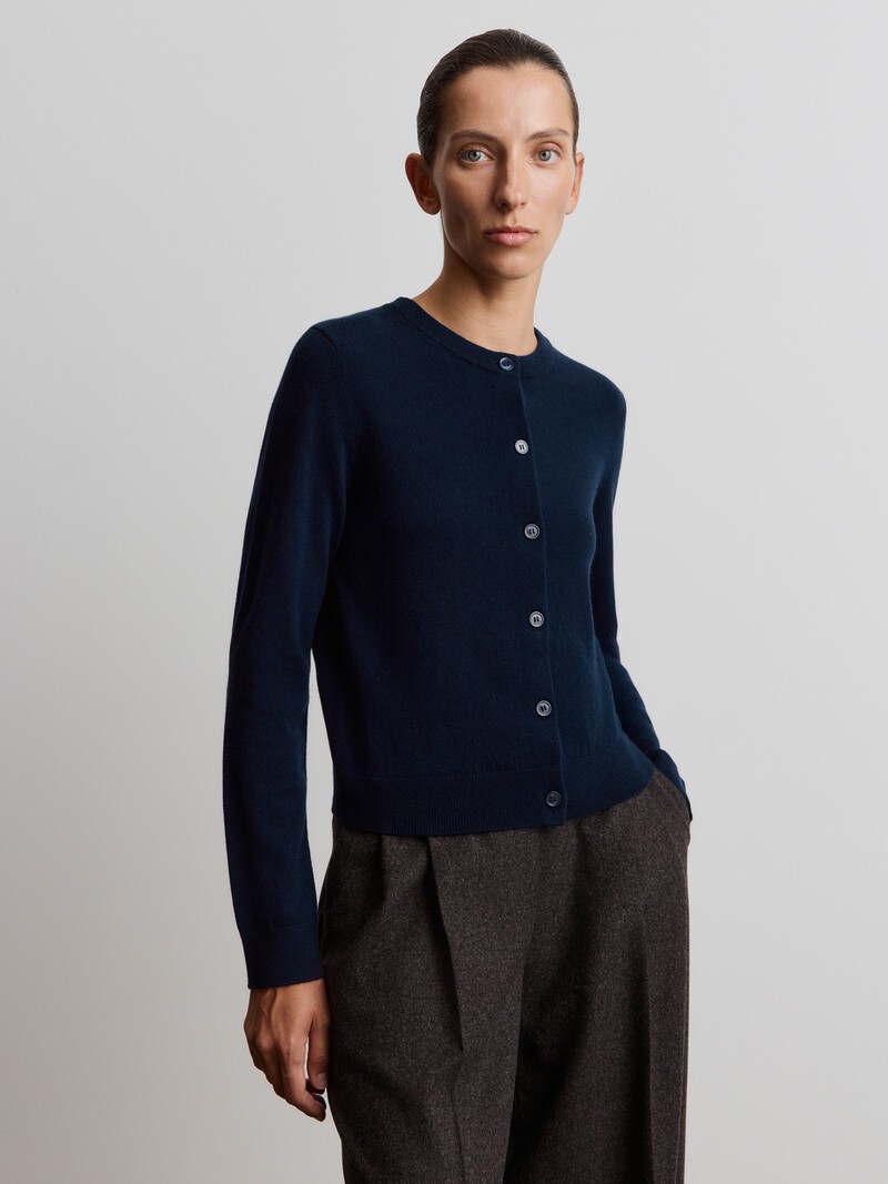 Аккуратный базовый кардиган — втачные рукава, резинка по краям, классический силуэт. Связан мелкими петлями в одну нить из пряжи, в составе которой 90% шерсти мериноса и 10% кашемира. Такой трикотаж получается плотным, пластичным, тонким и легким. Застегивается на пуговицы из перламутра. При трении о шероховатые поверхности пушистая нить может скатываться. У этого изделия средняя пиллингуемость. При правильном уходе первые пилли могут появиться на нем спустя 4-7 носок. Для удаления пиллей пользуйтесь специальной машинкой.