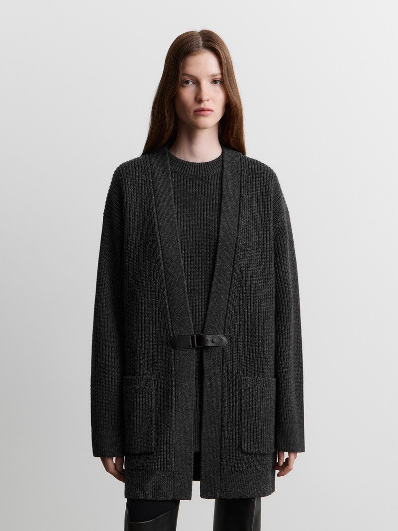 Удлиненный кардиган, который заменит пальто в осенние дни и согреет зимой. Он связан объемной французской резинкой из очень мягкой мериносовой шерсти и дополнен ремешком из натуральной кожи с металлической пряжкой. При трении о шероховатые поверхности пушинки могут скатываться. При правильном уходе первые пилли могут появится на изделии спустя 4-7 носок. Чтобы удалить пилли, пользуйтесь специальной машинкой. Сделано в Китае.