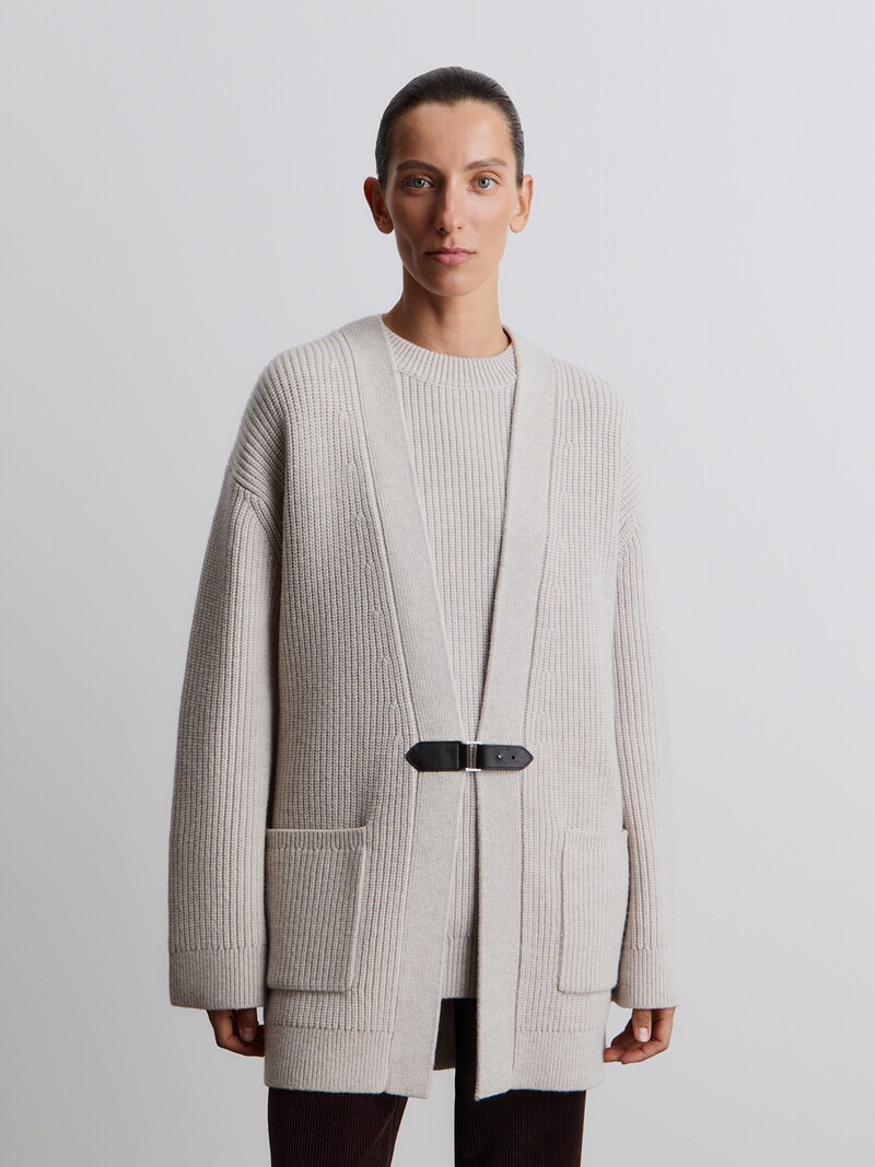 Удлиненный кардиган, который заменит пальто в осенние дни и согреет зимой. Он связан объемной французской резинкой из очень мягкой мериносовой шерсти и дополнен ремешком из натуральной кожи с металлической пряжкой. Первые пилли могут появиться через 4-7 носок. Чтобы удалить их, пользуйтесь специальной машинкой.