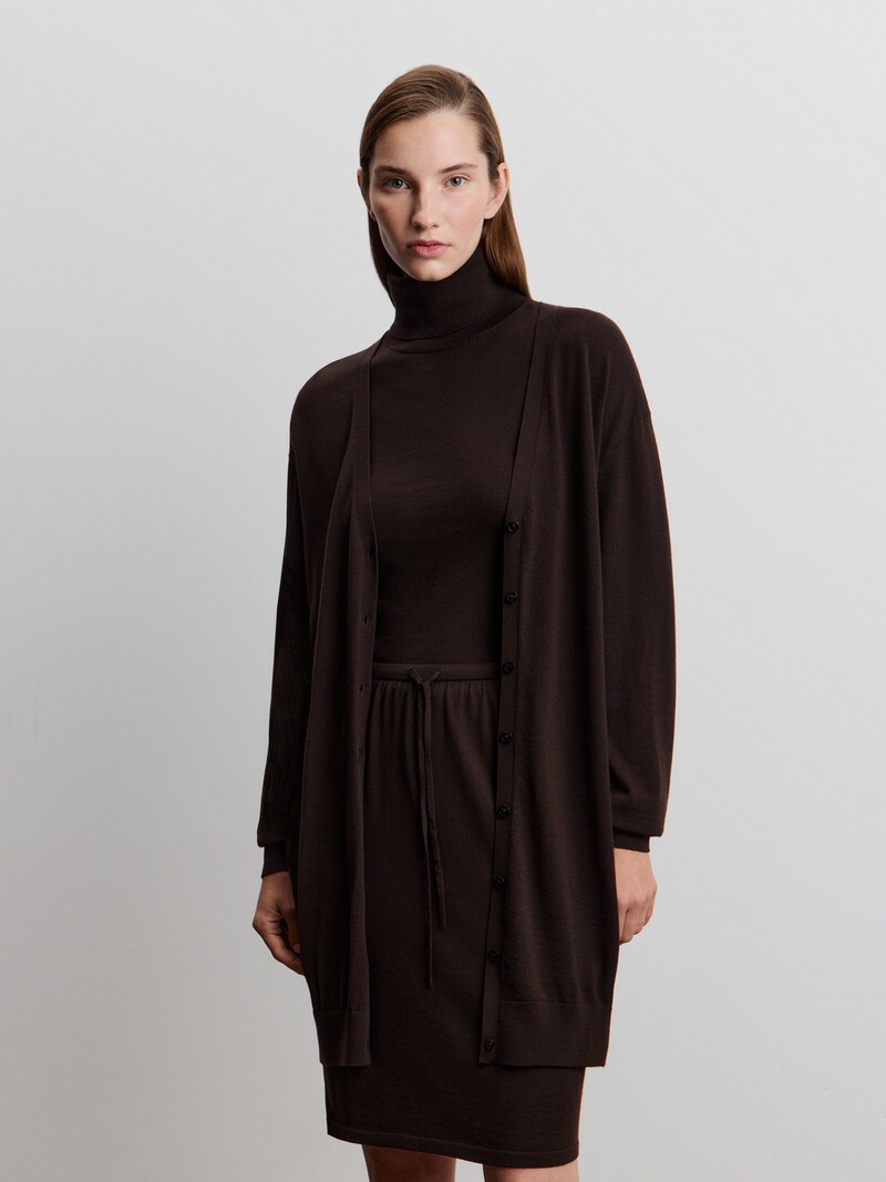 Кардиган из очень тонкой, деликатной шерсти мериноса поможет создать комфортный и не перегруженный образ в прохладные дни. Мы выбрали пряжу теплого природного оттенка и сделали кардиган удлиненным — так вам будет еще уютнее. Застегивается на перламутровые пуговицы. У этого изделия низкая пиллингуемость. При правильном уходе первые пилли могут появиться на нем в среднем через 10 носок. Сделано в Китае.