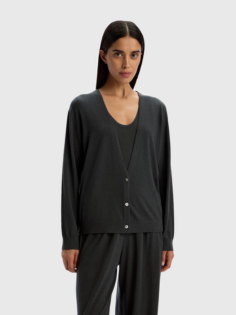 Объемный базовый кардиган для многослойных образов. Глубокий вырез, плавные линии и деликатный материал позволят вписать его в любой гардероб. Связан в одну нить из тонкой деликатной шерсти мериноса. Застегивается на пуговицы из натурального перламутра. Пожалуйста, обращайтесь с кардиганом бережно: острые предметы и аксессуары могут оставить на тонком трикотаже зацепки или повредить нить. У этого изделия низкая пиллингуемость. При правильном уходе первые пилли могут появиться на нем в среднем через 10 носок. Сделано в Китае.