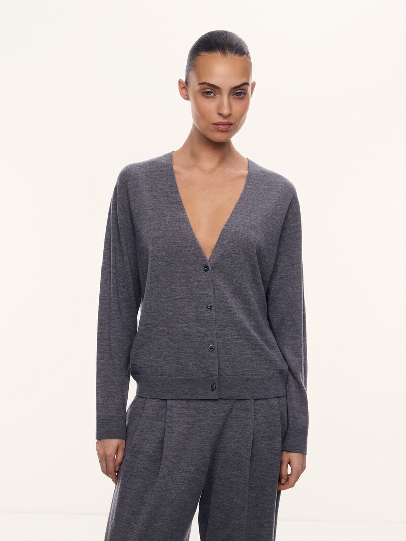 1. Нежный воздушный трикотаж из шерсти мериноса и кашемира — он связан в одну нить крошечными петлями и почти не ощущается на теле 2. Эту модель мы уже выпускали и доработали: сделали вырез менее глубоким — посадка стала комфортнее 3. Застегивается на пуговицы из натурального неокрашенного перламутра