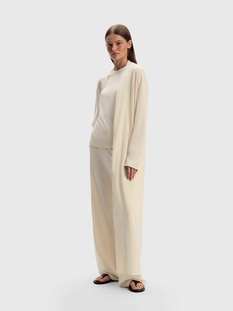 Невесомый длинный кардиган с узким пояском-шнурком — он держится на нитяных шлевках и тоже выглядит легким. Тонкий дышащий трикотаж с деликатным блеском приятно холодит кожу и в движении напоминает шлейф. Носите его с платьем мини или вещами из шелка — смешение разных фактур сделает образ особенно интересным. У этого изделия низкая пиллингуемость. При правильном уходе первые пилли могут появиться на нем в среднем через 10 носок.
