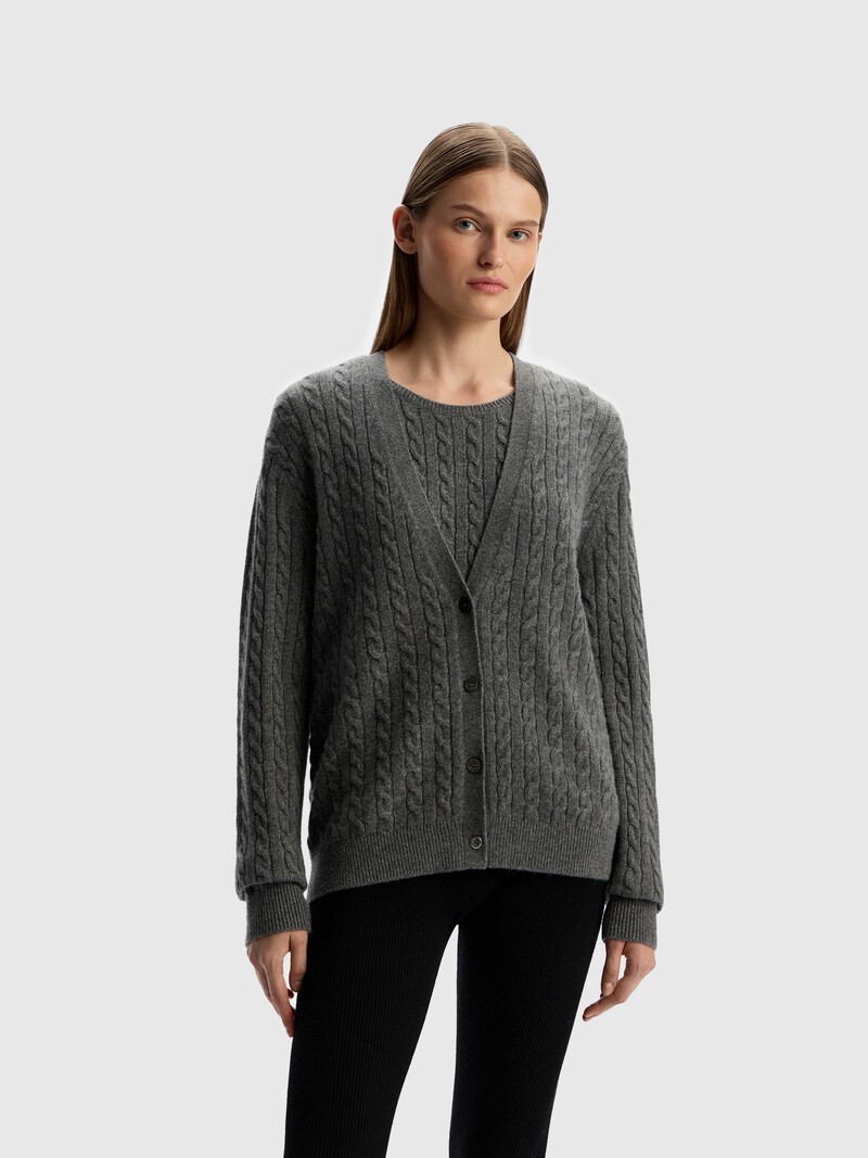 Аккуратный и уютный кардиган с узором косами и глубоким V-вырезом. Чуть спущенное плечо, свободный силуэт — такой комфортно носить как второй слой — например, в сочетании с топом из нашей коллекции. Связан в две тонкие нити из нежной и невесомой пряжи — 100% кашемира из региона Внутренняя Монголия. Трикотаж получился достаточно плотным, не просвечивает и не выглядит буднично. Застегивается на пуговицы из перламутра. У этого изделия средняя пиллингуемость. При правильном уходе первые пилли могут появиться на нем спустя 4-7 носок. Сделано в Китае.