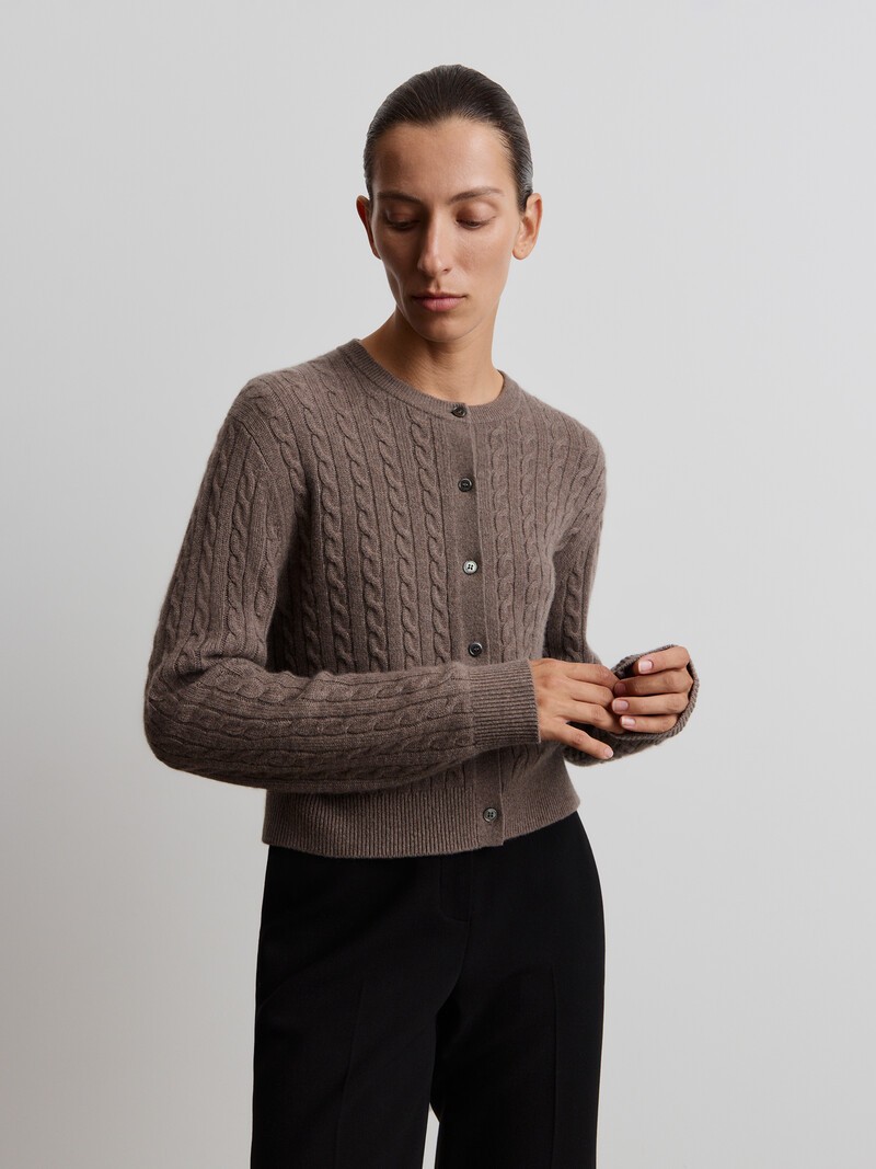 Связанный косами в две нити, этот легкий и теплый кардиган подойдет ко всему и сделает осень еще уютнее. Нежную и пушистую кашемировую пряжу из Внутренней Монголии дополняют изящные пуговицы из перламутра. При трении о шероховатые поверхности пушинки могут скатываться. Чтобы удалить пилли, пользуйтесь специальной машинкой.