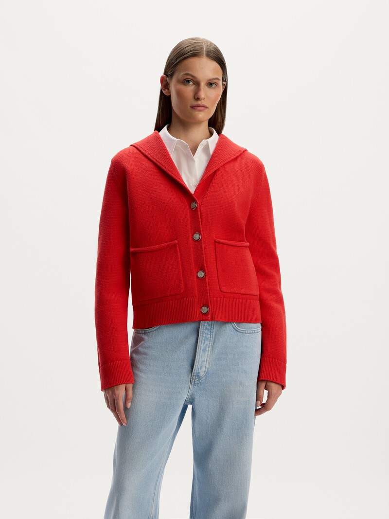 Вязаный жакет с накладными карманами — для по-летнему расслабленных образов. Он сочетается с любыми брюками или джинсами. Квадратный воротник-гюйс красиво раскладывается по плечам, напоминая о беззаботных прогулках на яхте. Связан гладью из легкого хлопка крупными, плотными петлями и хорошо держит форму. Застегивается на акцентные пуговицы с серебристой серединкой и ободком. У этого изделия низкая пиллингуемость. При правильном уходе первые пилли могут появиться на нем в среднем через 10 носок. Сделано в Китае.