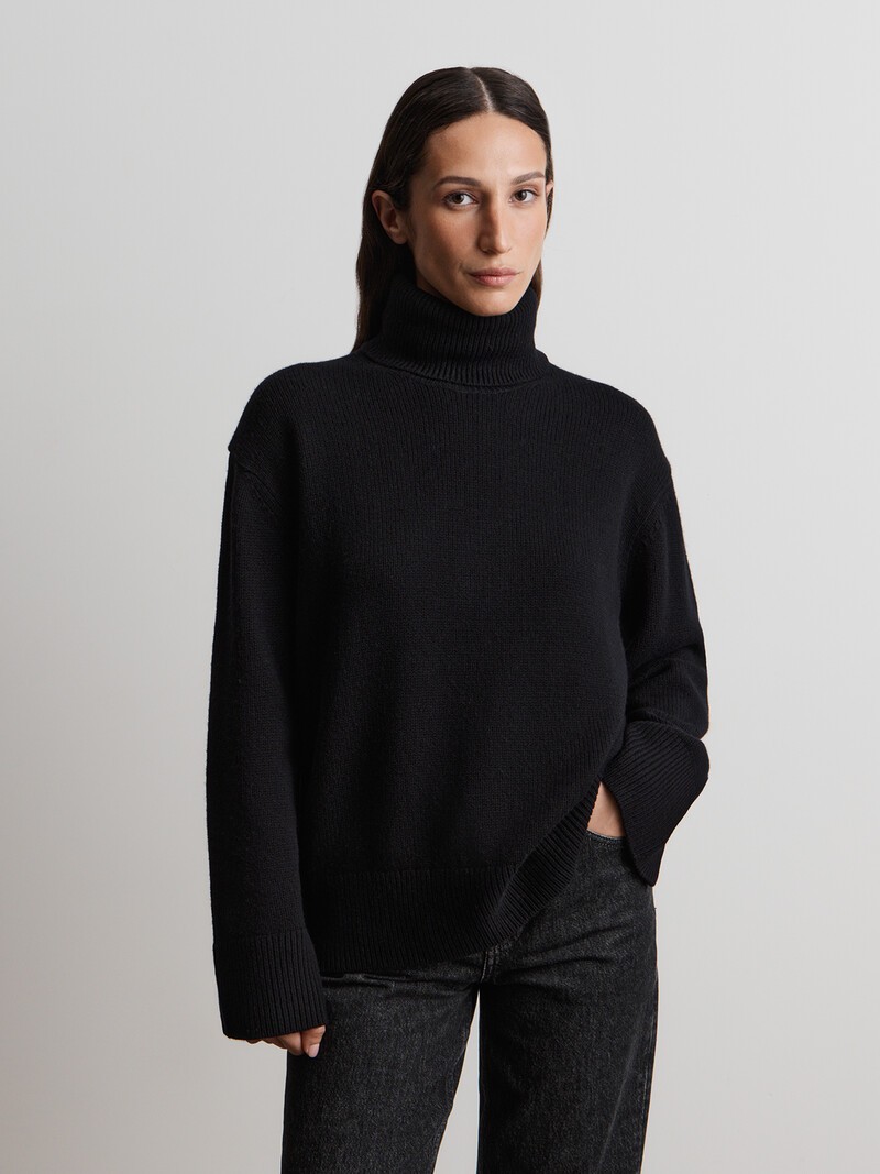 Уютный свитер из мягкой мериносовой шерсти. Объемный, с высоким отложным воротником и широкими планками из резинки. Такой свитер легко вписать в базовые гардероб, плотный, связанный в четыре нити трикотаж позволит носить эту модель весь холодный сезон. При трении о шероховатые поверхности пушистая нить может скатываться. У этого изделия средняя пиллингуемость. При правильном уходе первые пилли могут появиться на нем спустя 4-7 носок. Для удаления пиллей пользуйтесь специальной машинкой. Сделано в Китае.
