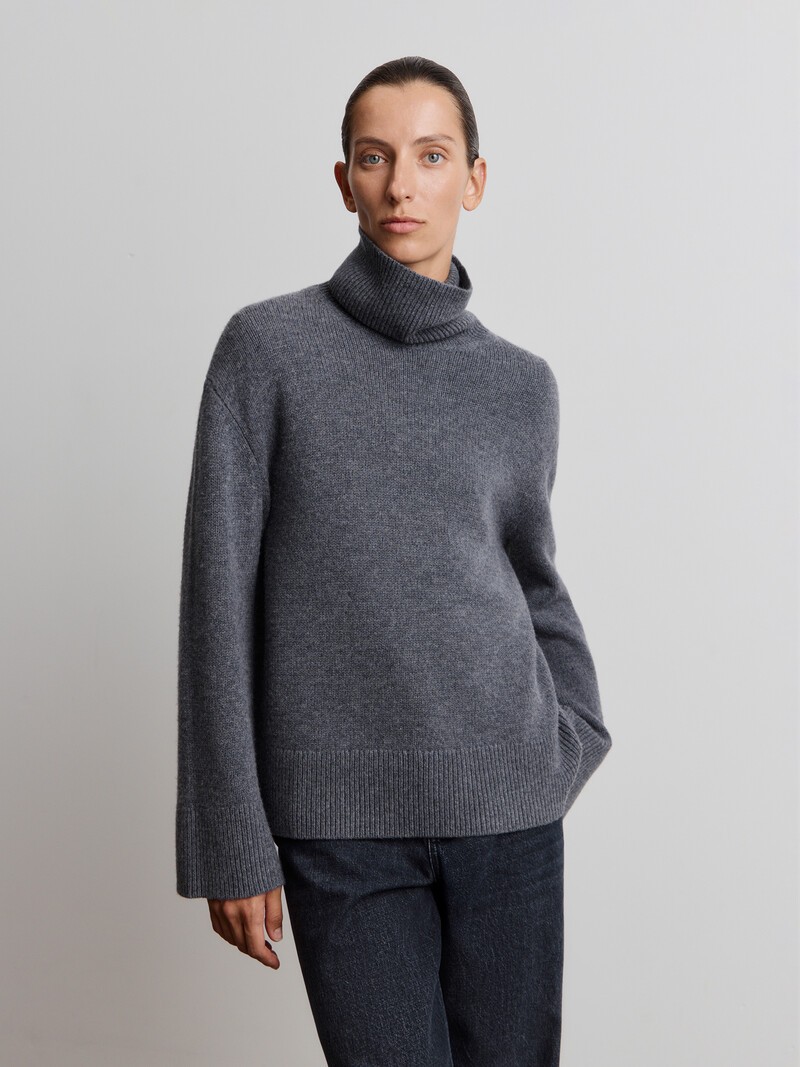 Уютный свитер из мягкой мериносовой шерсти. Объемный, с высоким отложным воротником и широкими планками из резинки. Такой свитер легко вписать в базовые гардероб, плотный, связанный в четыре нити трикотаж позволит носить эту модель весь холодный сезон. При трении о шероховатые поверхности пушистая нить может скатываться. У этого изделия средняя пиллингуемость. При правильном уходе первые пилли могут появиться на нем спустя 4-7 носок. Для удаления пиллей пользуйтесь специальной машинкой.