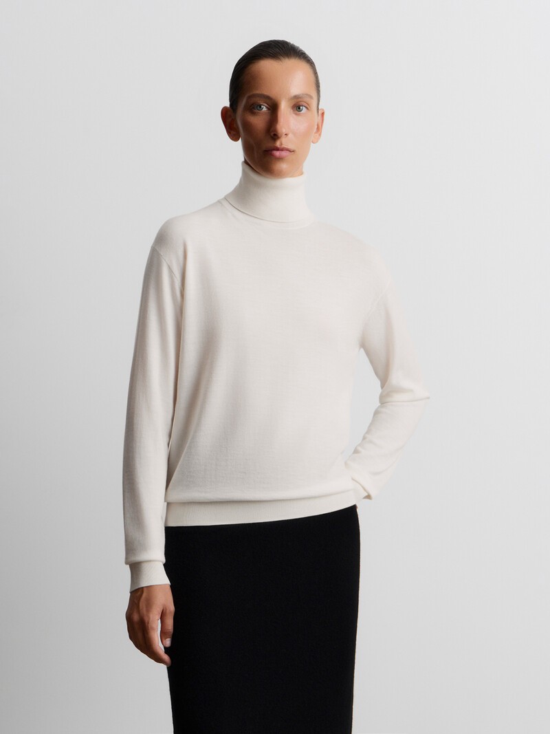 Любимая модель наших покупателей — водолазка из тонкой мягкой шерсти мериноса. Просторный силуэт, упругие резинки по краям и комфортный высокий воротник делают эту модель похожей на мужской джемпер, придавая вашим повседневным образам больше остроты. У этого изделия низкая пиллингуемость. При правильном уходе первые пилли могут появиться на нем в среднем через 10 носок. Сделано в Китае.