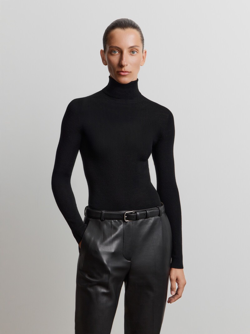 Эта бесшовная водолазка незаменима в прохладные дни — она комфортно облегает силуэт и отлично подходит для ношения под жакет. Тонкая и легкая пряжа из шерсти мериноса совсем не колется, а благодаря особой обработке волокон водолазка не теряет форму после стирок — возможно, поэтому она уже несколько сезонов остается бестселлером нашей коллекции. У этого изделия низкая пиллингуемость. При правильном уходе первые пилли могут появиться на нем в среднем через 10 носок. Сделано в Китае.