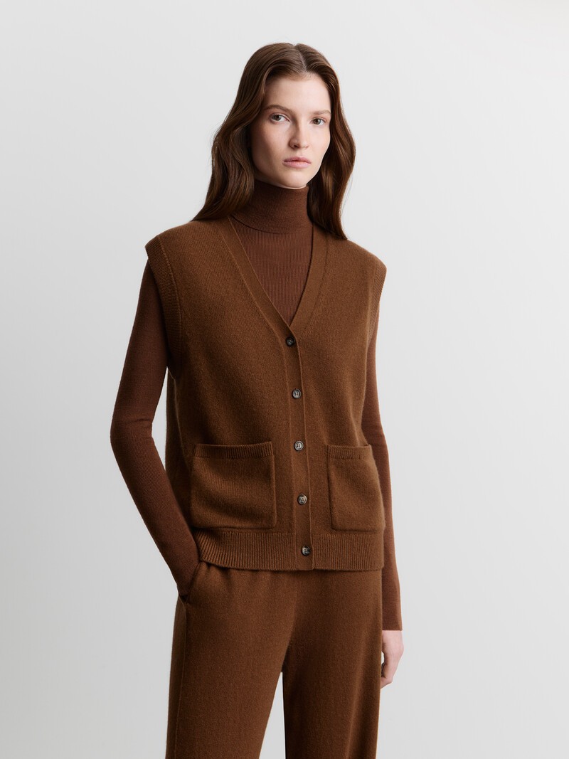 Кашемировый жилет — немного винтажный и будто мужской. Связан гладью в две нити из легкого, нежного пуха кашмирских коз, обитающих во Внутренней Монголии, свободный и очень теплый — то, что нужно для заботы о себе в холодные дни. При трении о шероховатые поверхности пушинки кашемира могут скатываться. При правильном уходе первые пилли могут появится на изделии спустя 4-7 носок. Чтобы удалить пилли, пользуйтесь специальной машинкой. Сделано в Китае.