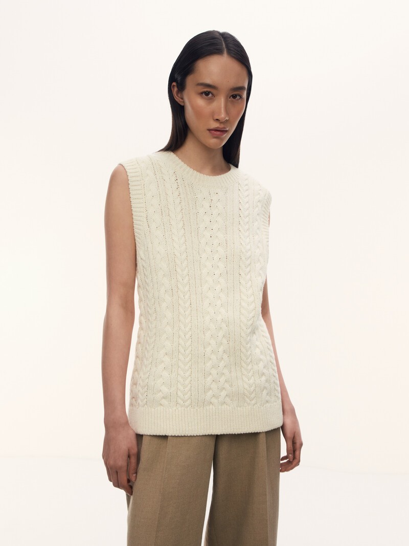 1. Легкий и дышащий: жилет связан из воздушной хлопковой нити объемным переплетением, которое напоминает ручную работу 2. Сочетание кос и жгутов делает образ более выразительным 3. Базовый силуэт без лишнего объема — легко интегрировать в гардероб