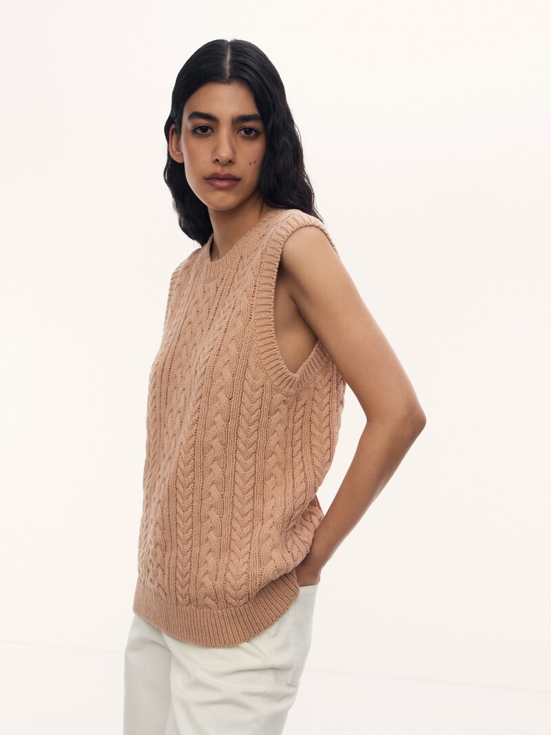 1. Легкий и дышащий: жилет связан из воздушной хлопковой нити объемным переплетением, которое напоминает ручную работу 2. Сочетание кос и жгутов делает образ более выразительным 3. Базовый силуэт без лишнего объема — легко интегрировать в гардероб