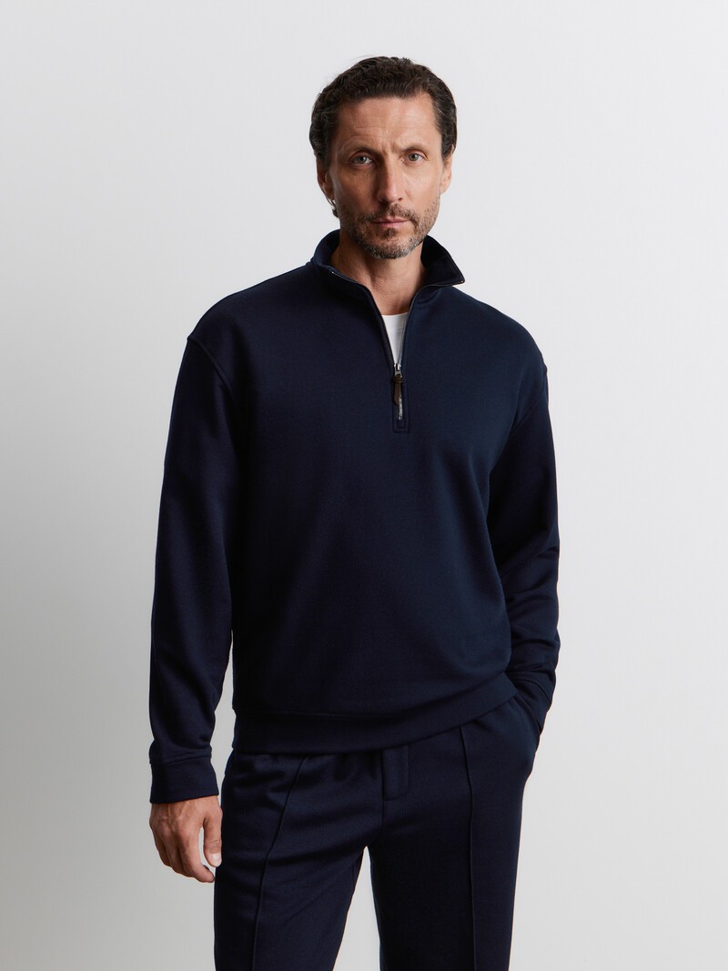 Для этой толстовки мы выбрали мягкую и теплую ткань из хлопка и шерсти: с изнаночной стороны она имеет небольшой и устойчивый начес. Металлическая молния с замшевым пуллером позволяет менять форму воротника. Это одежда, в которой будет комфортно и работать в офисе, и неспешно гулять в выходной. Сделано в Китае.