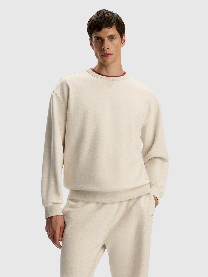 Уютная базовая толстовка — свободная, с маленьким нашитым треугольником около выреза. По нижнему краю — аккуратно вышитый нитями в тон логотип 12 STOREEZ. Выполнена из плотного легкого футера с меланжевой текстурой и мягкими петельками на изнанке. Искусственные волокна в составе материала помогают ему хорошо держать форму, создавать объем и оставаться пластичным. Сделано в Китае.