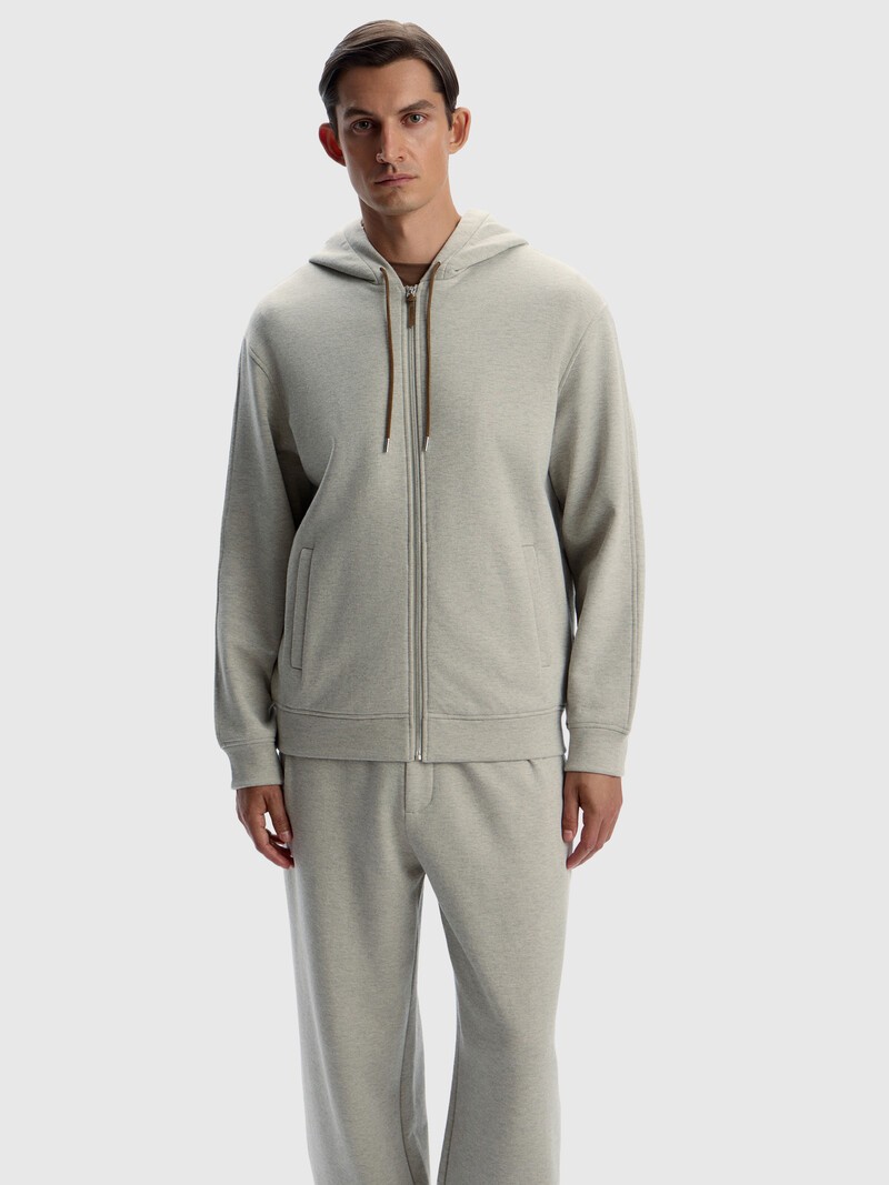 Уютное худи с начесом — свободный силуэт, классическая длина, удобные карманы. Сшито из мягкой, теплой и шелковистой ткани на основе вискозы и шерсти — объемного, средней плотности футера, изнаночная сторона которого начесана и подстрижена. Пуллер и шнурок в капюшоне выполнены из замши. Застегивается на металлическую молнию. Сделано в Китае.