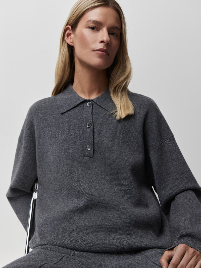 Базовый джемпер с изящными перламутровыми пуговицами и застежкой поло — универсальная модель для образов с широкими брюками, денимом, кроссовками или кедами. Мы выбрали для него мягкую тонкую пряжу из мериносовой шерсти с добавлением хлопка, согревающую и дышащую. Сделано в Китае.
