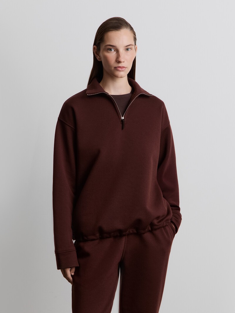 Толстовка из мягкого футера с легким начесом — уютная и теплая благодаря шерсти в составе. Застежка на металлическую молнию дополнена съемным пуллером из замши, а кулиска снизу позволяет менять силуэт — от более сдержанного прямого до укороченного спортивного. Сделано в Китае.