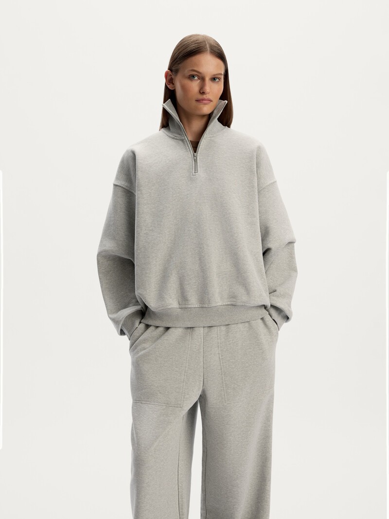 Объемная толстовка с высоким воротником на молнии и спущенным рукавом — комфортная и универсальная. Она подойдет для прогулок, отдыха и путешествий. Материал — плотный и легкий хлопковый футер с мягкими петельками на изнанке, который хорошо держит форму. Особенность этой модели — деликатная вышивка нитями в тон. Сочетайте с брюками из нашей коллекции. Сделано в Китае.