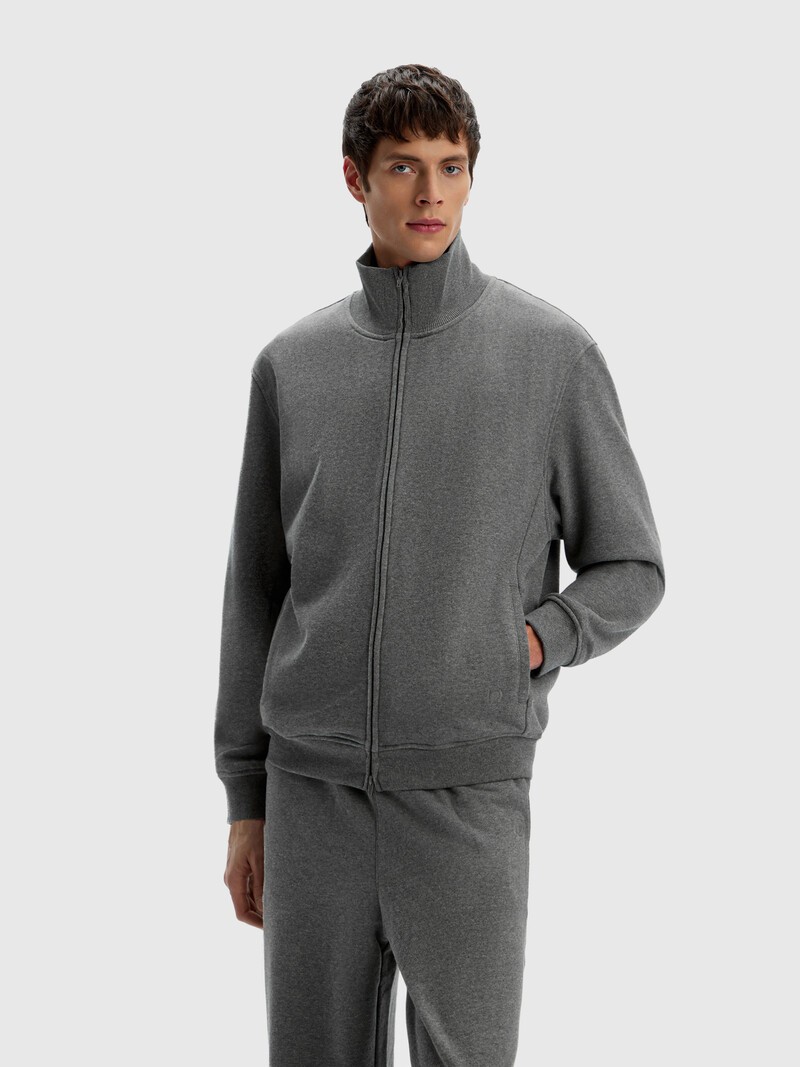 Свободная и аккуратная толстовка с высоким воротником — для повседневных образов. Выполнена из темно-серого футера с меланжевой фактурой, плотного и комфортного. Снаружи ткань обработана специальными щетками, придающими материалу особую мягкость и образующими на поверхности деликатный ворс. Застегивается на двухзамковую молнию. Комбинируйте с брюками из нашей коллекции. Сделано в Китае.